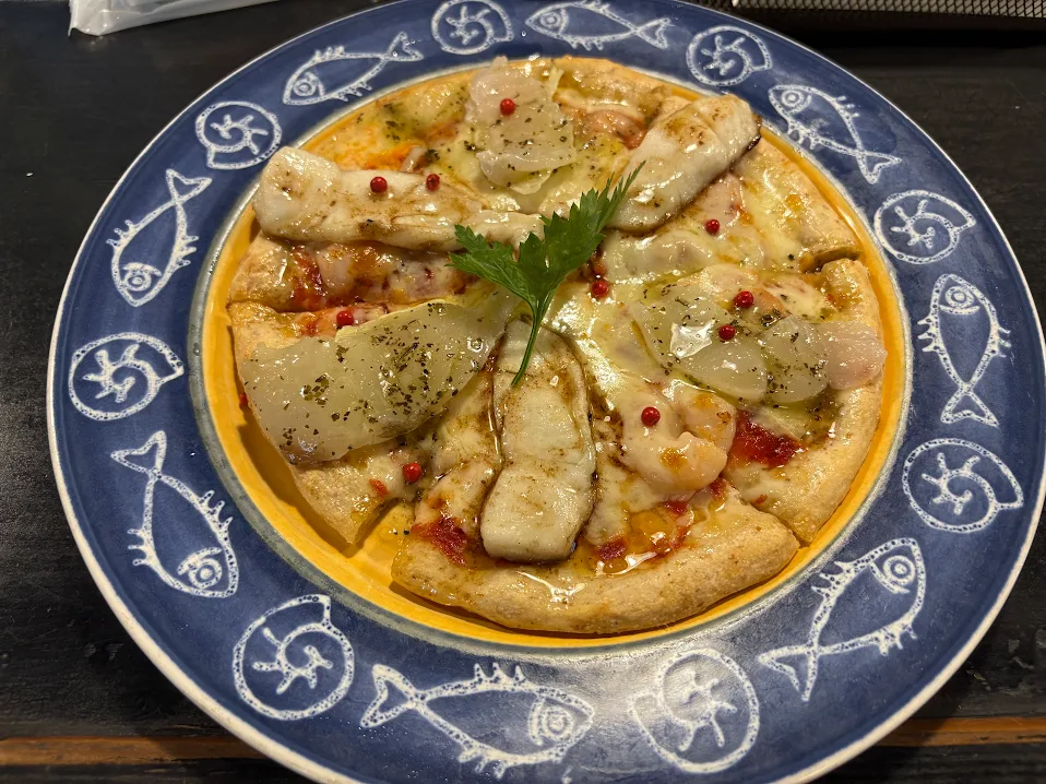 ヒラメのソテーとヒラメのカルパッチョが乗った贅沢なピザ。